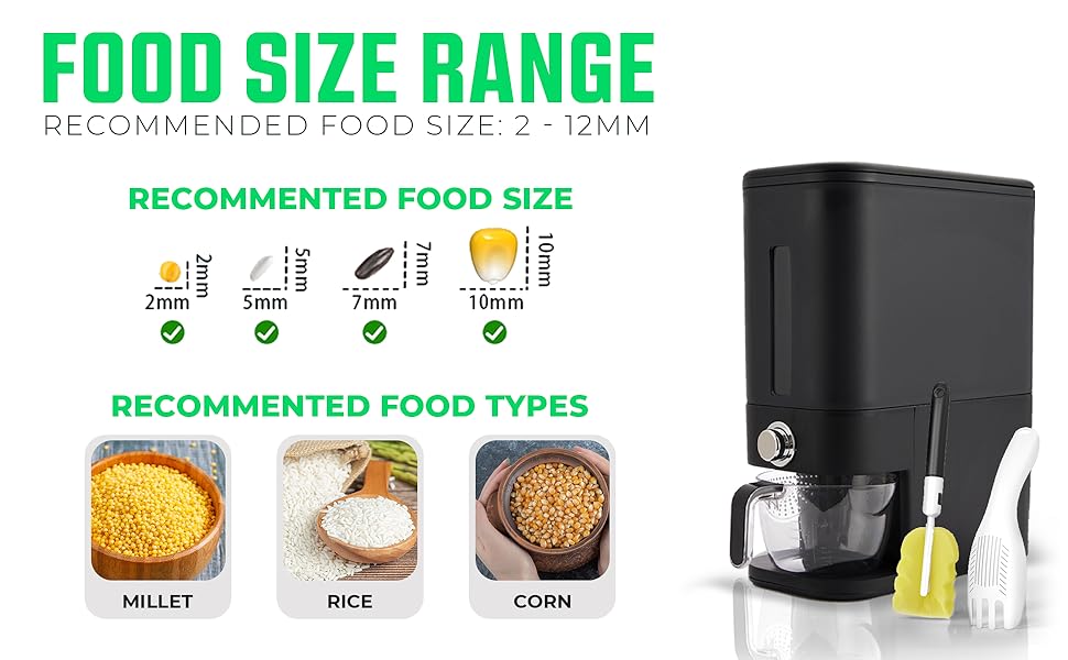 Integrated Scoop : This grain storage container dispensador de cereal equipped with a specially designed scoop, ensures you can easily serve and portion your rice without spills or mess. The grain dispenser rice bin scoop fits neatly within this large rice storage container, providing convenient access and reducing kitchen waste.